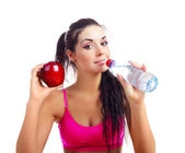 Koncepcja sportu, diety, zdrowia i ludzi: młoda Wesoła Kobieta w sporcie z jabłkiem i butelką wody, wyizolowana na białym tle