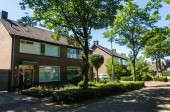 Lage Mierde, Holandia-czerwiec, 13 2019: domy ceglane budynki i pomnik Lage Mierde Holland. Południowej Holandii. Brabancja Północna
