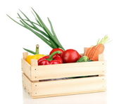 Fresh vegetables in wooden boxes on white background