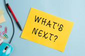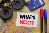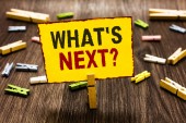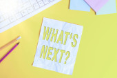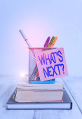Słowo pisanie tekstu jakie S następne pytanie. Koncepcja biznesowa do zadawania demonstracji na temat jego najbliższych działań lub zachowań pasiaste Tektura Notebook karton biuro badania dostaw papieru wykres.