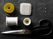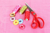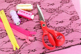 Różowy kolorowy płaski lay góry widok narzędzia do szycia z teksturą tkaniny