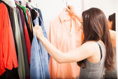 piękna młoda kobieta myśli co się ubrać w pobliżu stojak z wieszakami