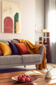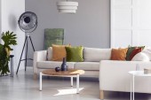 Żółte, pomarańczowe, czarne i brązowe poduszki na wygodnej szarej skandynawskiej sofie w jasnym salonie z abstrakcyjnymi obrazami na ścianie