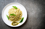 Spaghetti z sosem pesto, oliwa z oliwek i liści bazylii.