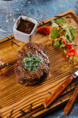 Zdjęcie "Grillowany stek wołowy, pokruszony ogórki i sos" może być wykorzystywane do celów osobistych i komercyjnych zgodnie z warunkami zakupionej licencji Royalty-free. Obraz jest dostępny do pobrania w jakości wysokiej rozdzielczości do 5760x3840.