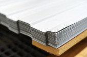Złożone w stosy w opakowaniach, w magazynie, wyrobów metalowych blach stalowych. Wyblakły metale blachy dla budownictwa. Korozji metalu