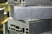 Złożone w stosy w opakowaniach, w magazynie, wyrobów metalowych blach stalowych. Wyblakły metale blachy dla budownictwa. Korozji metalu
