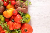 Mieszanka pomidorów tle. Piękne soczyste organiczne czerwone pomidory na czarnym tle tabeli. Koncepcja czystego jedzenia. Kopiuj przestrzeń, płaski lay