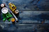 Widok z góry na moździerze z tłuczek w pobliżu świeżych ziół na powierzchni drewnianej z kopią