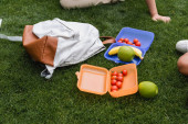 Widok z góry kobiety trzymanie plastikowego widelca w pobliżu warzyw w pojemniku na żywność