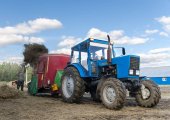 Brodaty rolnik w kapelusz słomy przy użyciu laptopa w pobliżu ciągnika