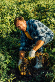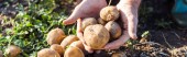 wykadrowany widok na własny rachunek rolnik posiadający ziemniaki w pobliżu pola kukurydzy