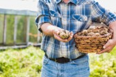 Happy Self-employed rolnik gospodarstwa drewniane pudełko z ziemniakami w pobliżu pola kukurydzy