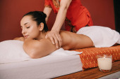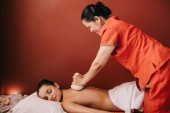 Asian masażysta robi z powrotem masaż dla kobieta na Mata do masażu