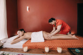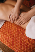 Widok z boku Asian masażysta robi z powrotem masaż z ziołowymi piłkami do kobiety w spa