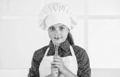 Szczęśliwa kobieta gotowanie zdrowej żywności przez przepis. Rzeźnik cięte mięso. Kobieta w kapeluszu kucharza i Apron. profesjonalnego kucharza w kuchni. Dania kuchni. Gospodyni domowa z nożem do gotowania. Śniadanie na słodko