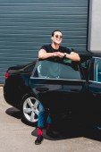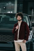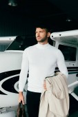 Widok z przodu młodego człowieka trzyma płaszcz i worek stojąc w pobliżu samolotu