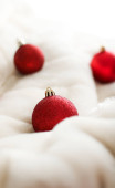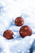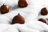 Czekolada brązowy Christmas bombki na białym puszysty futro tło,
