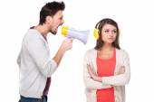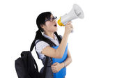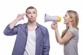 krzyk dziewczyny za pomocą głośników - na białym tle