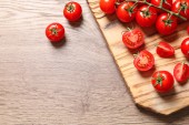 Płaska kompozycja z świeżymi dojrzałymi pomidorami na drewnianym stole. Miejsce na tekst
