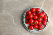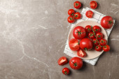 Płaska kompozycja z świeżymi dojrzałymi pomidorami na marmurowym stole. Miejsce na tekst