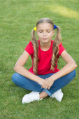 Szczęśliwy uśmiechnięty uczeń. Baw się dobrze. Dziewczyna Cute dziecko układania zielonej trawy. Zdrowy emocjonalny szczęśliwy dzieciak relaks na świeżym powietrzu. Co sprawia, że dziecko jest szczęśliwe. Dziewczyna ponytails fryzura cieszyć się zrelaksować. Wesoła uczennica