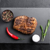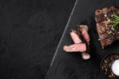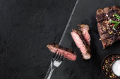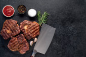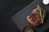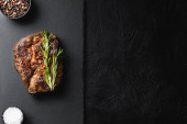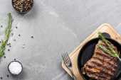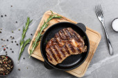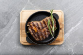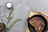 smażony stek na patelni na szarym marmurowym stole widok z góry