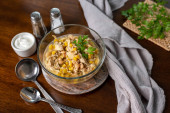 Zdjęcie "Turcja Stroganoff na białym stole z drewna z zielonych fasoli i przypraw" może być wykorzystywane do celów osobistych i komercyjnych zgodnie z warunkami zakupionej licencji Royalty-free. Obraz jest dostępny do pobrania w jakości wysokiej rozdzielczości do 5760x3840.