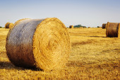 Wiele rolek siana na polu letnim w Hiiumaa, Estonia