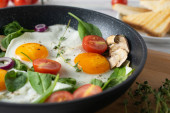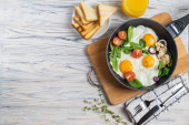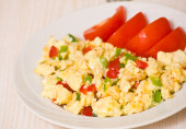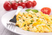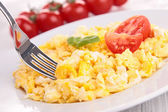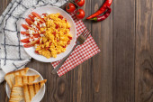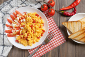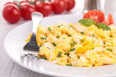 Z bliska jajecznica z pieprzem, pomidorami i serem na białej płytce