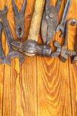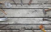 Narzędzia do stolarstwa i akcesoriów na czarnym tle drewna.