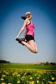 Zdjęcie "Młoda dziewczyna skoczyła wysoko w zielonym polu" może być wykorzystywane do celów osobistych i komercyjnych zgodnie z warunkami zakupionej licencji Royalty-free. Obraz jest dostępny do pobrania w jakości wysokiej rozdzielczości do 5760x3840.