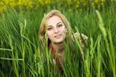 Dziewczyna w czerwonej sukni siedzi w zielonej trawie w polu w lecie i patrzy na kamerę