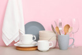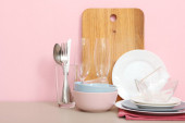 Zdjęcie "Zestaw naczyń i naczyń kuchennych na kolorowym tle." może być wykorzystywane do celów osobistych i komercyjnych zgodnie z warunkami zakupionej licencji Royalty-free. Obraz jest dostępny do pobrania w jakości wysokiej rozdzielczości do 5760x3840.