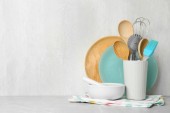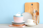 Zestaw naczyń i naczyń kuchennych na kolorowym tle.