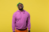 Czarny mężczyzna w żółtej Bluzy z kapturem zrobienie śmiesznej twarzy na kolorowym tle