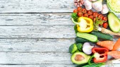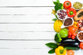 Zdjęcie "Świeże warzywa i owoce na białym tle. Widok z góry. Bezpłatna przestrzeń kopiowania." może być wykorzystywane do celów osobistych i komercyjnych zgodnie z warunkami zakupionej licencji Royalty-free. Obraz jest dostępny do pobrania w jakości wysokiej rozdzielczości do 5760x3840.
