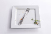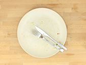 Brudny talerz z resztki jedzenia i widelec na drewnianym tle, widok z góry