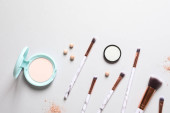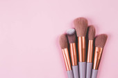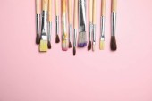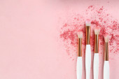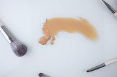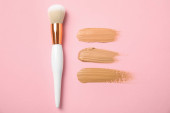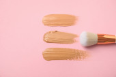 Próbka płynnej podkładu i pędzla do makijażu na różowym tle