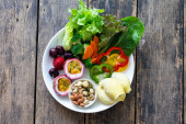 Sałatka owocowo-warzywna na białej płytce na drewnianym stole