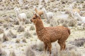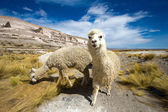 Lamy pasą się przez bagna boliwijskie altiplano w pobliżu t