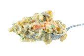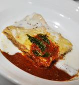 Lasagna służył na białej płytce z sałatką. Włoskie jedzenie.