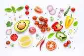 Tło żywnościowe i sałatka koncepcja z surowych składników płaskich lay