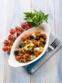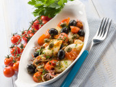Filet z dorsza z czarnymi oliwkami i świeże pomidory