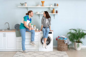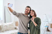 Zdjęcie "Bezpośrednio nad widokiem pozytywnej pięknej pary w dżinsy siedzi na podłodze parkiet w kuchni i picia czerwonego wina na rocznicę" może być wykorzystywane do celów osobistych i komercyjnych zgodnie z warunkami zakupionej licencji Royalty-free. Obraz jest dostępny do pobrania w jakości wysokiej rozdzielczości do 5760x3840.