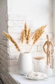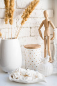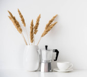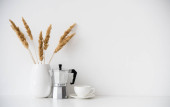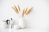 Biały wystrój domu, ekspres do kawy, ceramiczny wazon i filiżanka na stole, współczesne wnętrze
