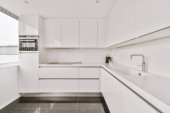 Zdjęcie "Nowoczesna kuchnia czarno-biały" może być wykorzystywane do celów osobistych i komercyjnych zgodnie z warunkami zakupionej licencji Royalty-free. Obraz jest dostępny do pobrania w jakości wysokiej rozdzielczości do 5760x3840.