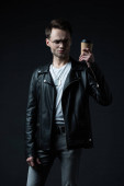 brutalny mężczyzna pokazując środkowy palec, trzymając się języka i trzymając szklankę whisky wyizolowaną na czarno
