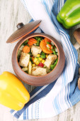 pieczone mieszane warzyw z piersi kurczaka w garnku, na jasnym tle