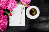 Koncepcja święta. Ołówek i pusty papier, aby utworzyć kartę okolicznościową. Filiżanka herbaty i bukiet róż na białym stole
